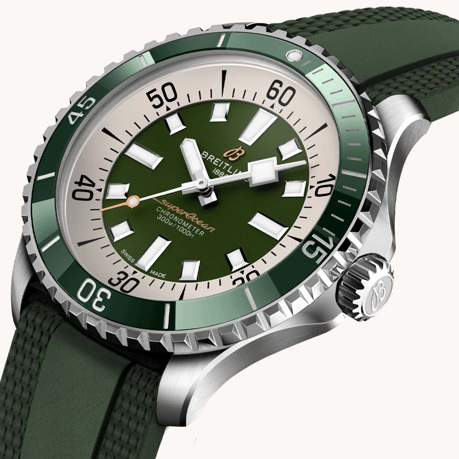 The new Superocean revisits the famous Slow Motion design codes, while adding modern elements such as a bezel with ceramic inlays and brightly colored dials. Its large hands and indexes in luminescent Super-LumiNova® make it easy to read underwater. The watch is water resistant to 300 m (1000 ft), and is shock, sand and salt water resistant.