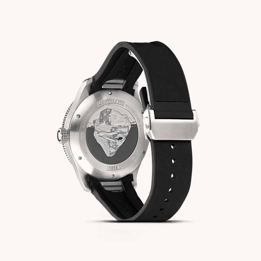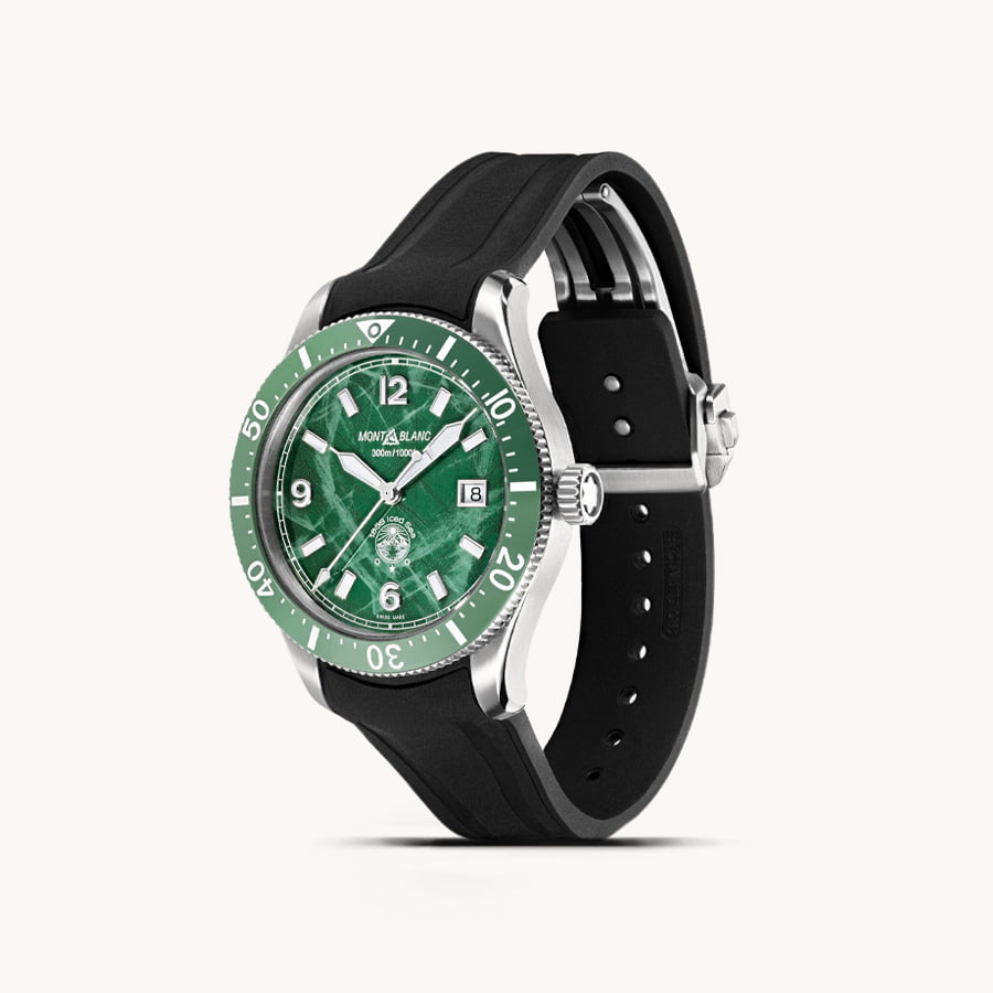 The Montblanc 1858 Iced Sea Automatic Date, Montblanc’s first sports diving watch, is characterized by the glacier motif on the dial, thanks to which we enter the depths of this mass of ice. This green dial with glacier motif is inspired by the Mer de Glace, the main glacier of the Mont Blanc massif. The texture has been achieved by means of a practically forgotten ancestral technique called gratté-boisé. This watch features a unidirectional two-tone ceramic bezel, an engraved case back and an interchangeable black rubber strap with a precise adjustment system. The watch meets the ISO 6425 standard for diving watches and is water resistant to 300 meters.
