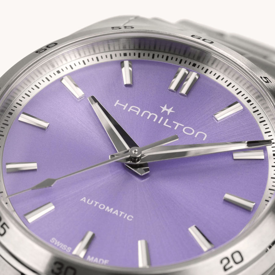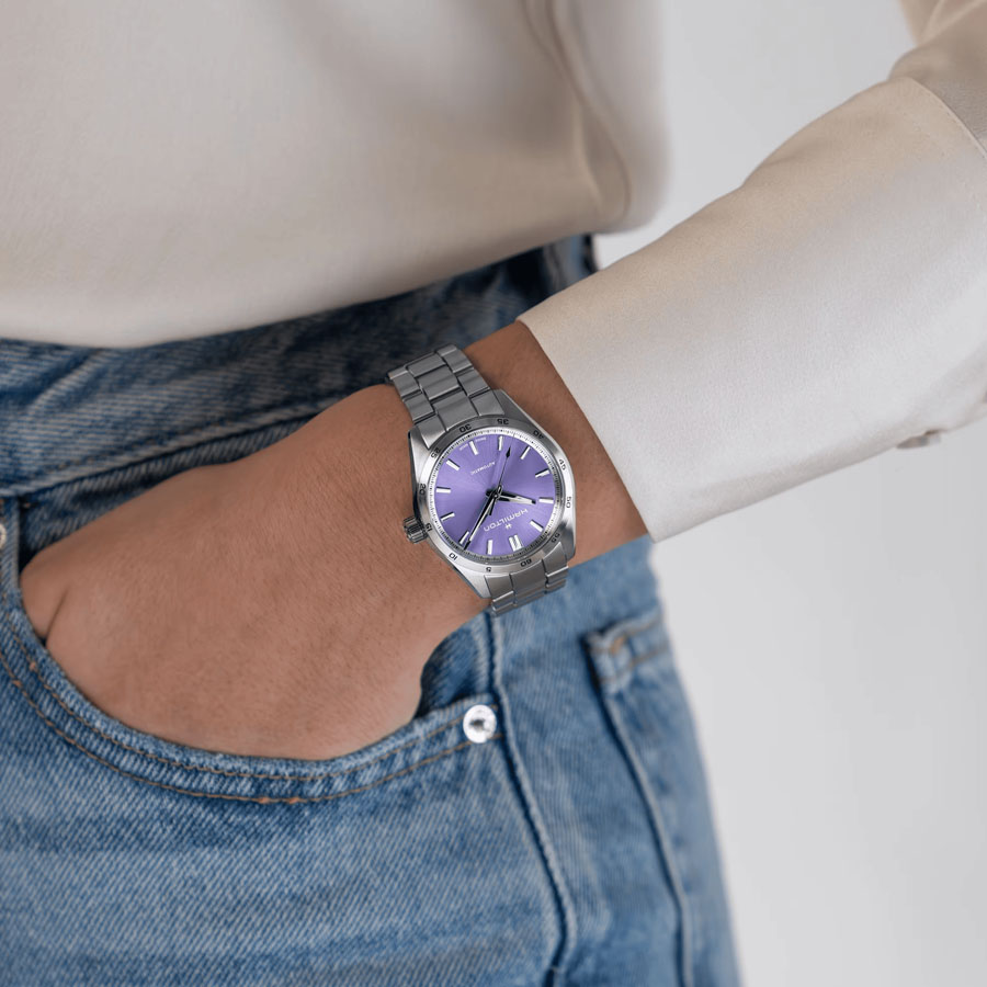 La línea Jazzmaster Performer, diseñada para quienes disfrutan de la funcionalidad y el estilo a partes iguales, ofrece una poderosa estética deportiva y refinada. El Jazzmaster Performer Automatic, impulsado por el movimiento automático H-10 con una reserva de marcha de 80 horas, presenta una caja de acero inoxidable de 34 mm realzada por una moderna esfera lavanda, índices niquelados y un refinado brazalete de acero inoxidable.