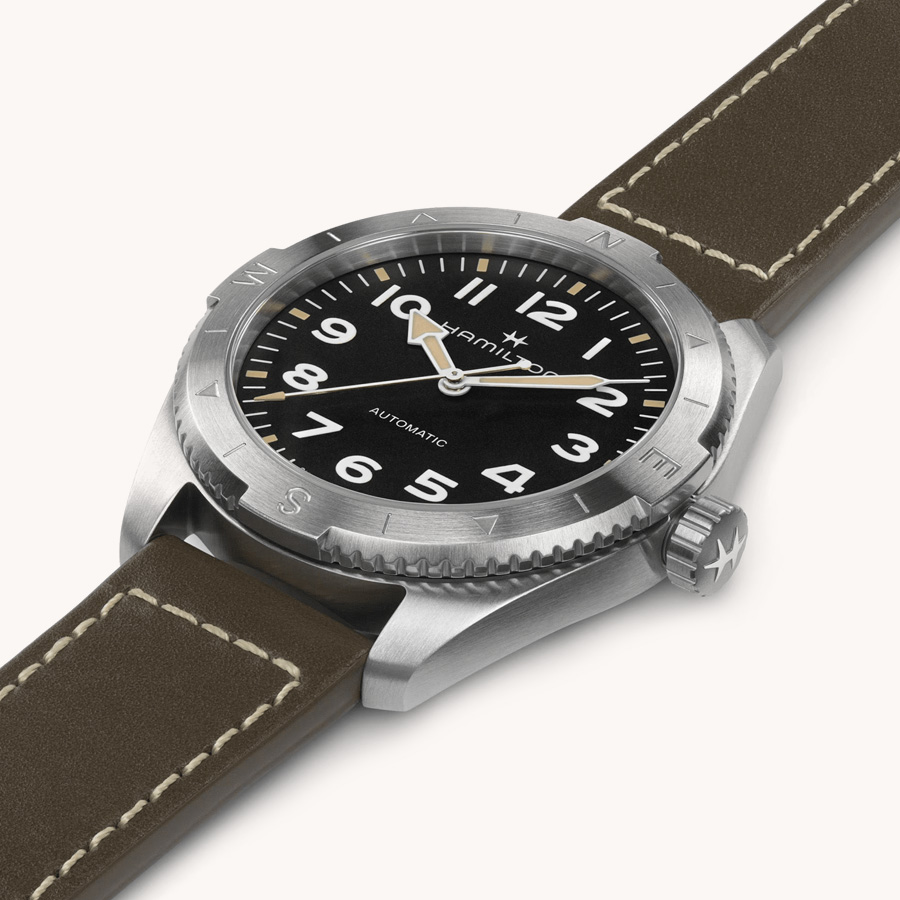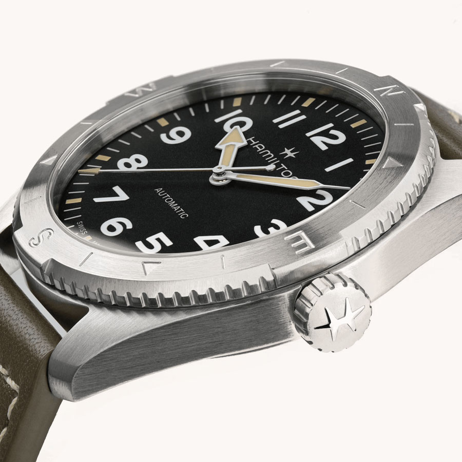 Prepárate para tus actividades al aire libre con el Khaki Field Expedition, un reloj de aventura todoterreno con un diseño de brújula que te permite proseguir la aventura con la ayuda del sol. Se alberga en una caja de acero inoxidable de 41 mm junto con una correa de piel verde, y está equipado con una corona atornillada para proteger el movimiento contra las inclemencias del tiempo. El Khaki Field Expedition, dotado de una esfera negra texturizada con revestimiento de Super-Luminova® para conseguir la máxima legibilidad, te ofrece la resistencia que necesitas.