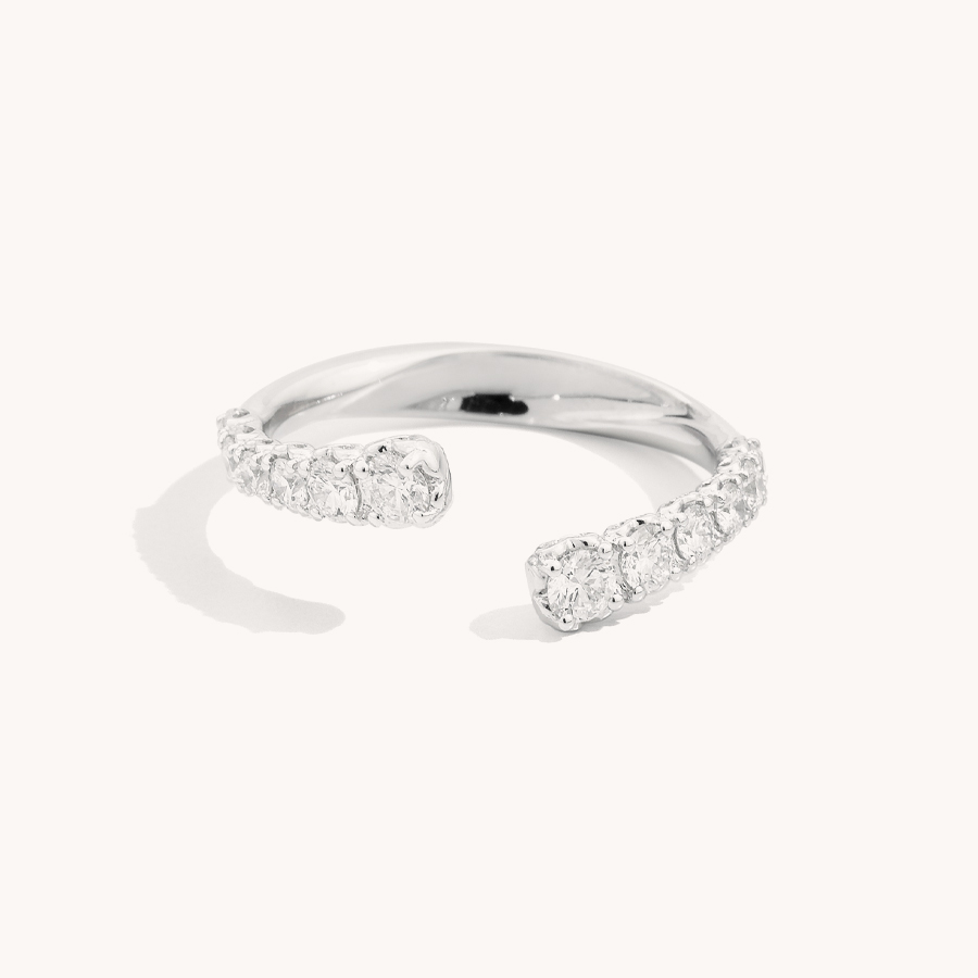Anillo abierto asimétrico graduado, oro blanco de 18 kt y diamantes naturales talla brillante.